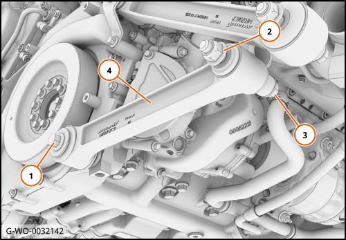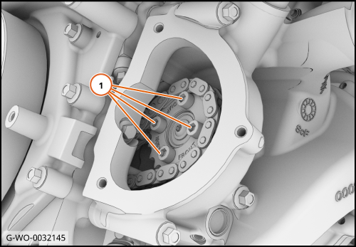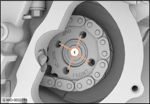 | 2. | Apply and maintain pressure on the chain tensioner (1).