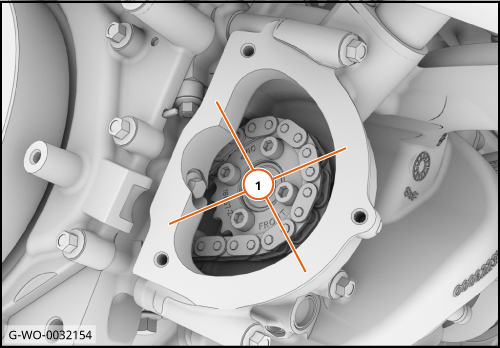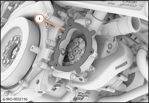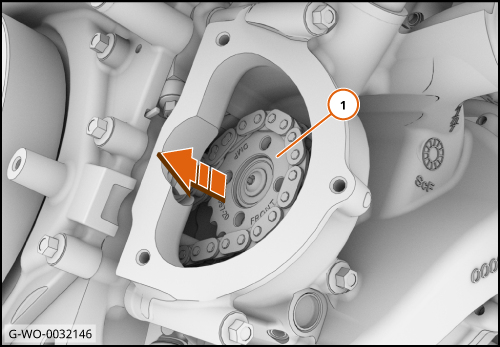 | | | 6. | Remove the sprocket (1) from the water pump spindle in the direction shown.