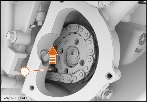 | | | 5. | Rotate the crankshaft (1) clockwise through 720° and inspect the chain guide and tensioner (2).