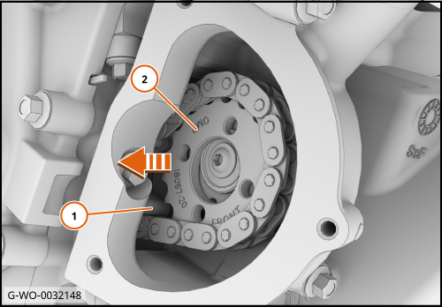 | 8. | Maintain pressure on the chain tensioner (1) and remove the chain from the sprocket (2).