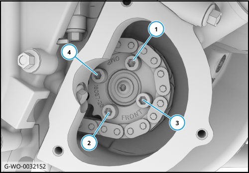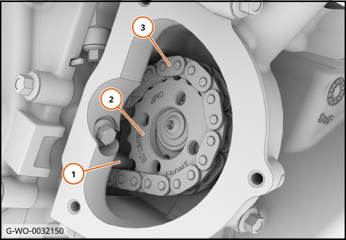 Install the water pump sprocket (2) and feed the chain around the sprocket (3).
